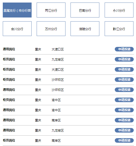 招聘条件 基本条件 1、基本要求。遵纪守法、诚实守信、品德端正、身体健康、无不良记录。具有较强的沟通协调和开拓创新能力,有团队合作精神。 2、学历要求。 (1)境内院校应届毕业生须具有国家统招的全日制普通高等院校大学本科(含)以上学历、学位,报到时须获得国家认可的就业报到证、毕业证和学位证。 (2)境外院校应届毕业生须具有境外正规高等院校本科(含)以上学历、学位,报到时须获得毕业证和学位证以及国家教育部出具的学历(学位)认证。 3、专业要求。以经济、金融、管理、统计、法学、信息技术、数学、物理、工程等专业背景为主。 区域条件 1、主城区(渝中区、南岸区、沙坪坝区、九龙坡区、大渡口区、江北区、渝北区、北碚区、巴南区) (1)境内院校应届毕业生不包含三本、独立院校以及民办高校。 (2)通过国家大学英语四级(CET4)考试(成绩在425分及以上),或托业(TOEIC)听读公开考试630分及以上,或新托福(TOEFL-IBT)考试75分及以上,或雅思(IELTS)考试5.5分及以上。 (3)英语专业毕业生应至少达到专业英语四级(含)以上水平。 (4)硕士研究生(含)以上学历或211、985以及双一流高校毕业生优先。 2、近郊区县(主城区和偏远地区以外的区县) 境内院校应届毕业生不包含三本、独立院校以及民办高校。 3、偏远地区(城口县、巫溪县、石柱县、酉阳县、秀山县、武隆区、万盛区、荣昌区、潼南区) 该区域岗位最低服务期限为3年,优先录用抗疫一线医务工作者、社区工作者子女和贫困大学生。 招聘流程