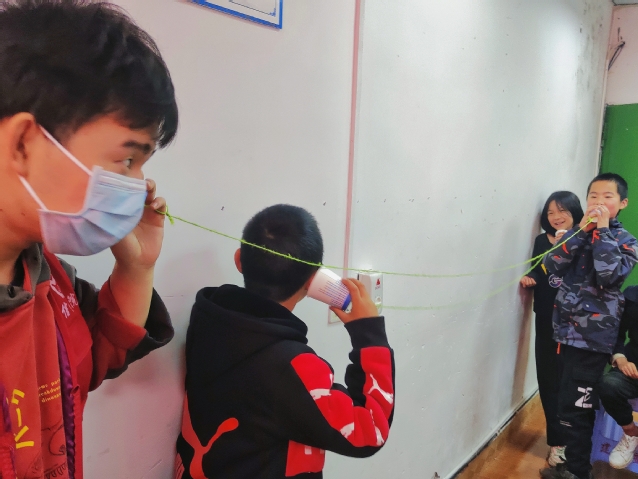 讲课结束后,志愿者和小朋友们一起学习如何制作传音筒,从小小的动手活动中,学习物理知识,体会物理的存在与奇妙。志愿者李欢教小朋友们如何玩数独小朋友们也积极回应,志愿者和小朋友们共同合作完成数独游戏。还开展了你来比划我来猜游戏,夸张的动作,让所有参与者都乐在其中。在此过程中,志愿者和小朋友相互熟悉,共同度过了一段美好的时光。最后,志愿者和小朋友们一起拍照,定格这一和谐又美好的时刻,正式结束此次支教活动。