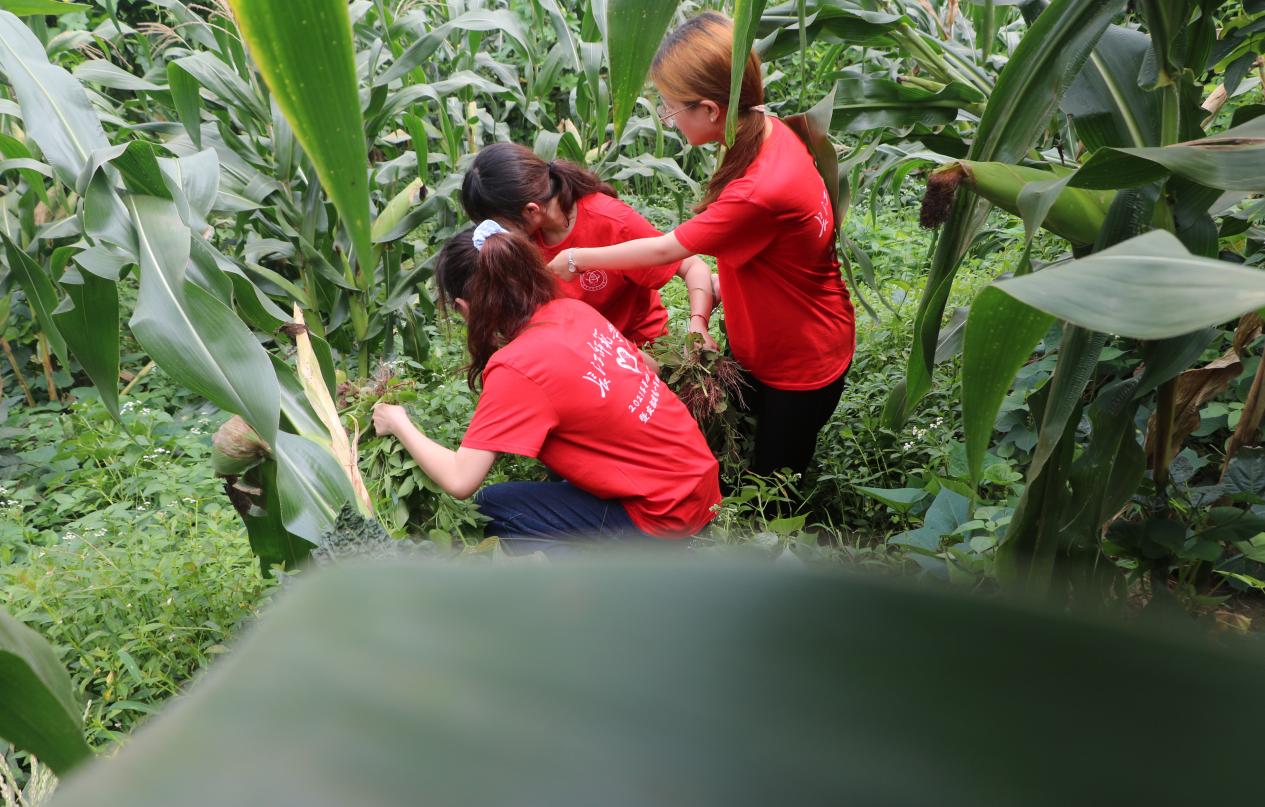 下午两点,大家出发为社区居民打理农活,在这晴朗闷沉的下午,田间地头充斥着一抹和党旗一样鲜艳的红色。一滴滴汗水从志愿者脸颊滑落,志愿者们依旧热情高涨,在收获劳动的快乐同时,深切体会到劳动人民的不易……