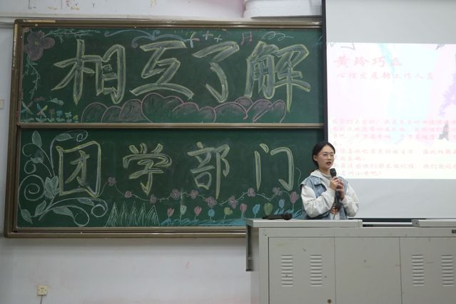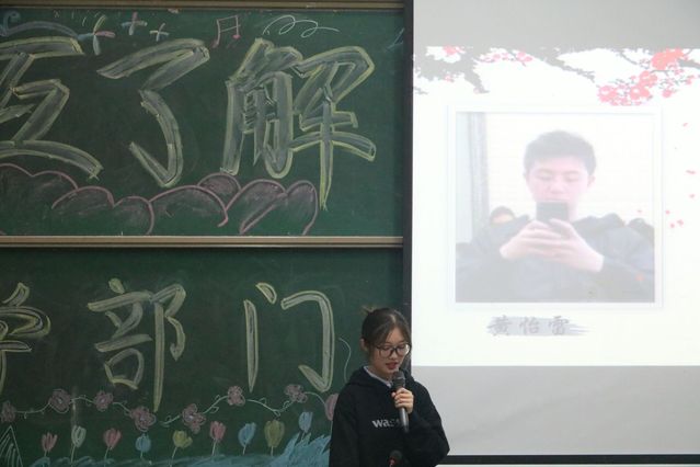 首先,党务部负责人从日常生活、人员介绍、生活方面三个方面展开介绍。其次,是创新发展部、生活部、办公室、纪检部先后展示其部门特色、部门成员、工作设想。在部门生活中不仅有严格、严谨的工作要求,也有温馨、快乐的部门活动。而后,心理发展部、就业部介绍他们部门的成员和工作。工作人员的兢兢业业、干事的以身作则,都为部门的工作共同努力。再者便是文体部、组织部、学风建设部、宣传部、新媒体中心、志愿者服务团、学生社区管理部、权益服务部介绍他们部门成员、职责及目标,并且为更好的未来提出了殷切的希望。交流会的最后,主席团成员黎翔说道:“在团学,可以展现自己,锻炼自己,提升自己,团学是相亲相爱的一家人。”