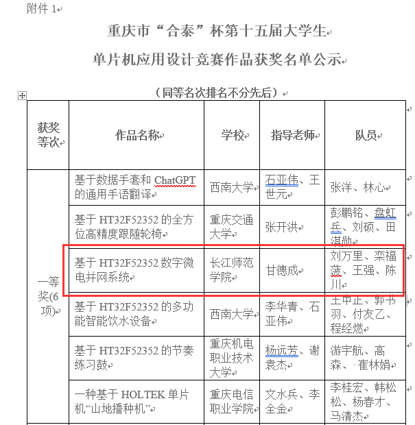 据悉,“合泰”杯重庆市大学生单片机应用设计竞赛是由重庆市教育委员会主办,重庆市高校实验室工作研究会、盛群半导体有限公司和重庆邮电大学联合承办开展的单片机应用设计竞赛。该竞赛采用市面上广泛应用的HOLTEK系列单片机为竞赛工具,以学生为中心开展实施,并由学生自主命题、设计完成整个作品创作,强调作品创意、团队协作,注重与生产实际和商业应用紧密结合,具有极其鲜明的竞赛特色,有助于高等学校实施素质教育,培养大学生的创新能力、协作精神、工程实践素质,吸引、鼓励广大青年学生踊跃参加课外科技活动,为优秀人才的脱颖而出创造条件。