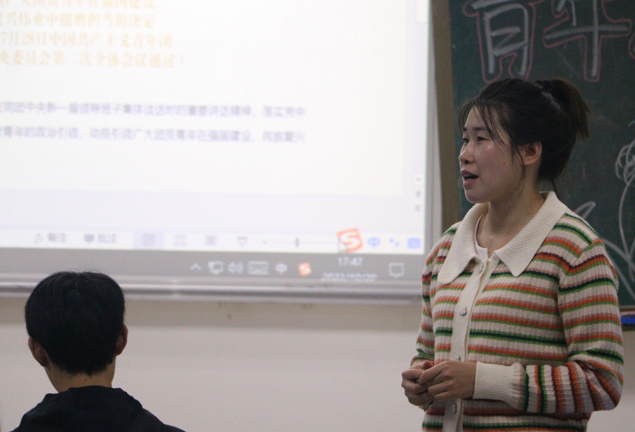 团会第一项:各班点名并齐唱团歌。而后,各班主持人引导同学们进行理论学习,充分认识并理解习近平总书记讲话的重大意义,把握新时代中国青年运动的主题。随后,从新时代大学生的使命与担当以及面对青年就业两个方面提出相关问题。同学们积极讨论踊跃发言:“作为新时代的青年,应志存高远、忠于祖国,努力做新时代具有远大理想和坚定信念的爱国者;作为新时代的青年,应敢于担当、勇于奋斗,努力做新时代具有责任意识和创新精神的建设者;作为新时代的青年,应勤奋学习、锤炼身心,努力做新时代具有过硬本领和高尚品格的接班人。”