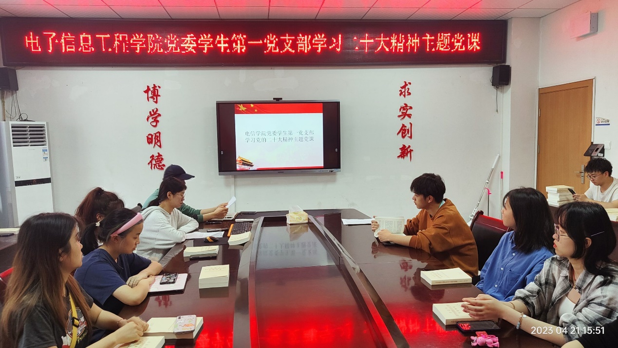 学生第一党支部于2023年4月21日15:30时在格物楼1417开展了线下学习二十大精神主题党课,本次活动由支部书记郑晓春主持,学生第一党支部学生党员积极参与。