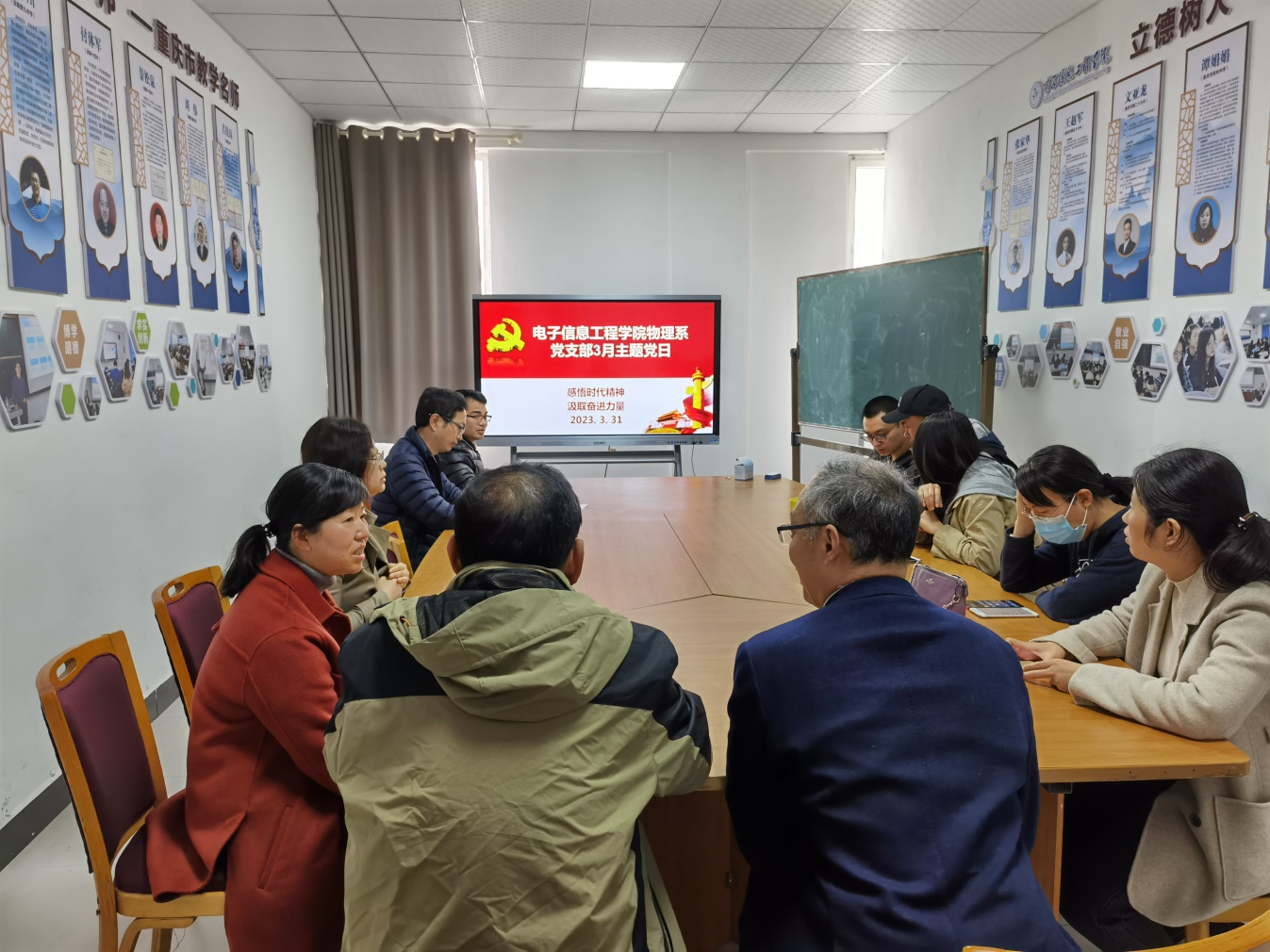 2023年3月31日,物理系党支部在2612会议召开“感悟时代精神 汲取奋进力量”主题党日活动。活动开始前,支部书记隆小江通报党员到会情况以及本次活动的内容,本次活动内容如下: 1.党员集中缴纳2023年3月党费,通报缴费情况;2.“学习强国APP”晒分;3.习近平在中共中央政治局第三次集体学习时的重要讲话精神;4.习近平:正确理解和大力推进中国式现代;5.葛泽玲同志说明关于物理学专业培养方案修订过程中的问题,请同志们思考;6.陶冶同志作了主题发言,提出了一些修订培养方案的建议。