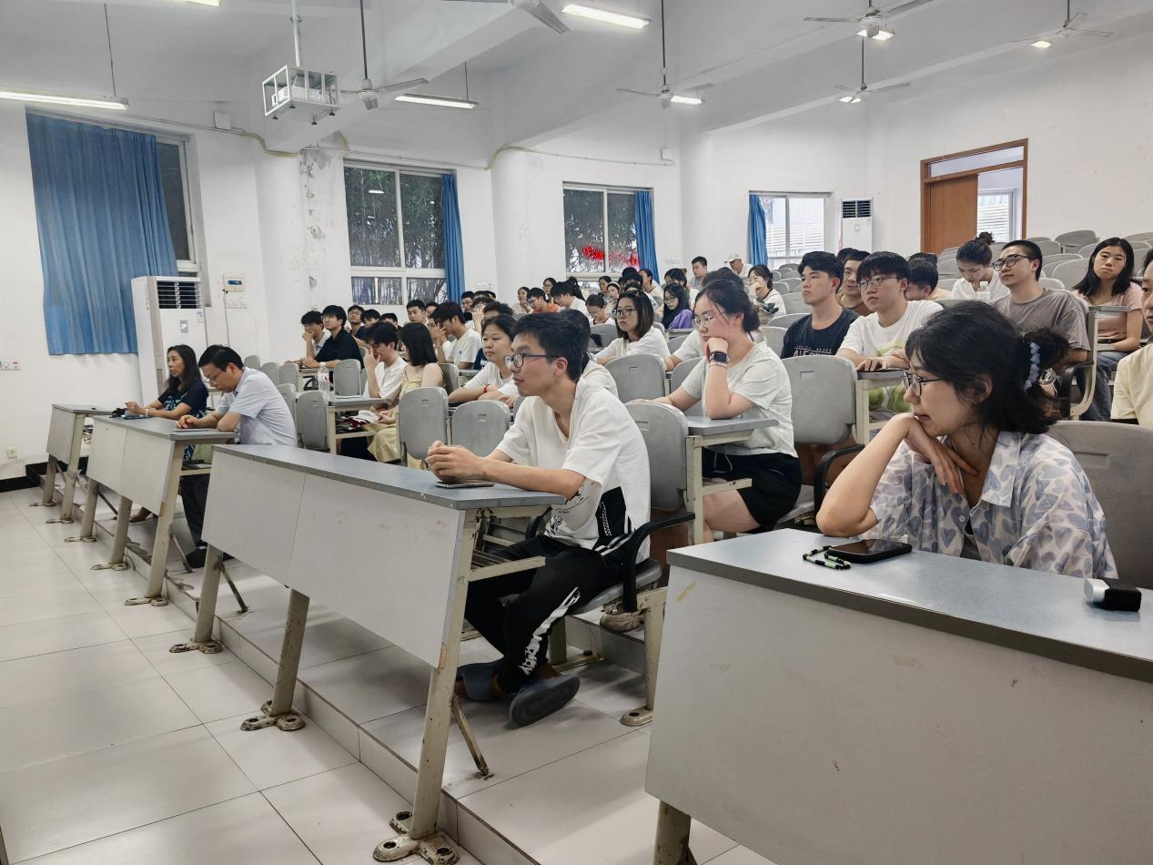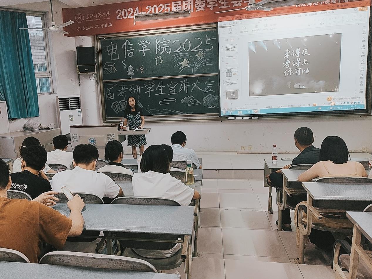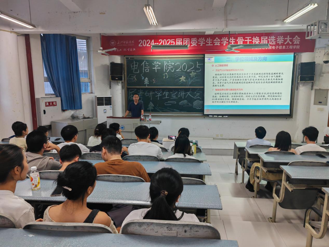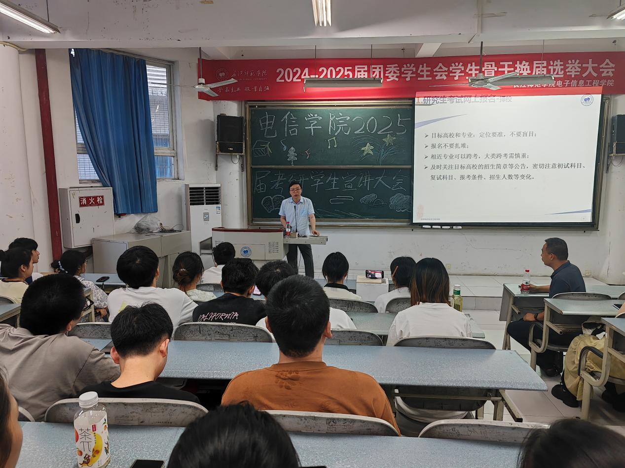 第一届研究生招生事宜进行了详细的宣讲。他向同学们全面介绍了电子信息专业学位、学位领域及方向、师资队伍建设、科研与实践条件、代表性研究成果以及奖助金政策这六个关键方面,为考研学生们提供了全面的政策解读和实用的备考建议,使同学们对我院研究生教育有了更深入的认识,也体现了学院对研究生教育工作的重视和对考研学子的关怀。