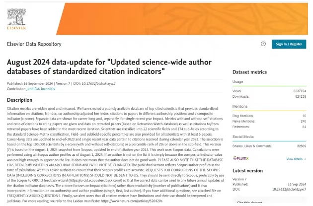 全球前2%顶尖科学家榜单是Elsevier与斯坦福大学John P. A. Ioannidis教授团队合作的项目成果,发布在Elsevier旗下的Mendeley Data网站上。榜单基于Scopus数据库的引用数据系统分析,以被引数(区分自引和他引,提供自引数据)、H指数、HM因子等6种综合指标 (composite score,C-score),根据 “生涯影响力”和“年度影响力”从近700万名科学家中遴选出世界排名前2%的科学家,分为22个领域和176个细分子领域;为科学家长期科研表现提供了一个衡量指标,能够更客观、更真实地反映科学家的影响力。 |