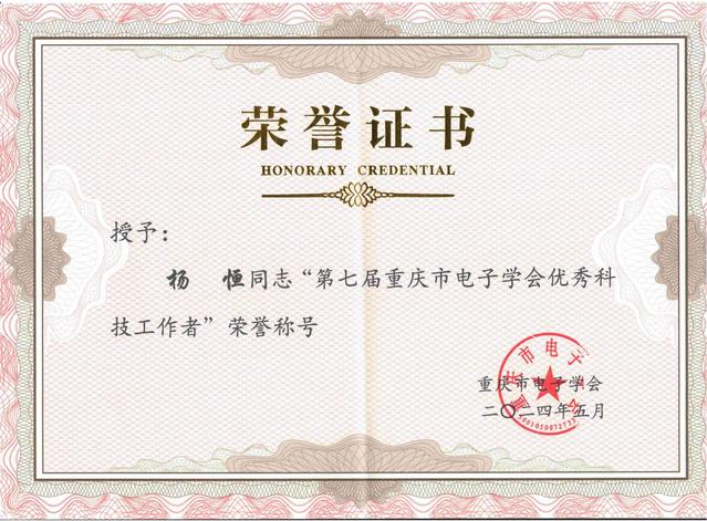 杨恒博士获“第七届重庆市电子学会优秀科技工作者”称号