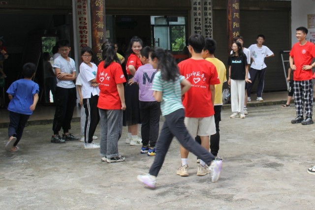 志愿者游丹带领孩子们进行热身运动之后,为同学们讲解了“贴狗皮膏药”的游戏规则。游戏过程中,大家积极参与,笑声连绵不绝,氛围十分活跃。活动即将结束时,其中一个小朋友轻轻拍了拍志愿者的肩笑着说:“哥哥,我还想和你玩。”这一刻,志愿者感受到支教的意义不仅仅在于让孩子们有所收获,更在于共同成长。