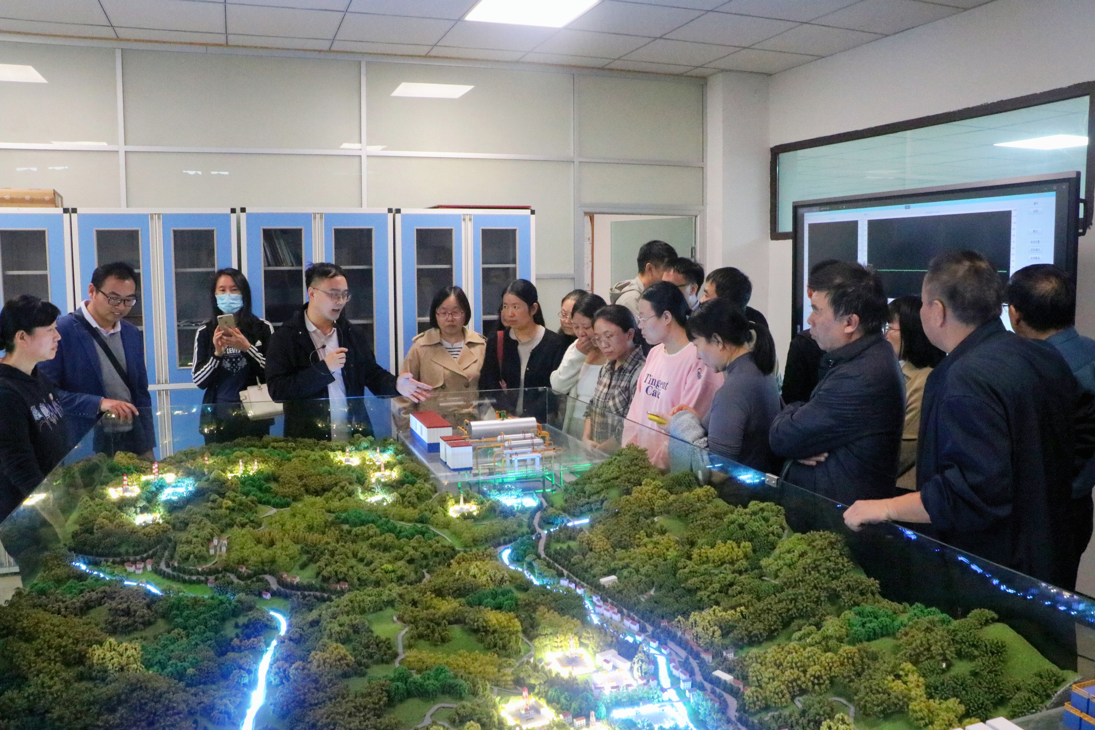 而后,老师们跟随党随虎院长来到至定南楼,参观页岩气光纤传感实验室。党院长和王远翀博士介绍了该实验室的重要实验设备及功能、以及目前实验室项目进展情况,并现场通过沙盘展示项目在实际运用中的研究成果.参观过程中,老师们聚精会神,纷纷发出赞叹,为学院发展感到无比自豪。