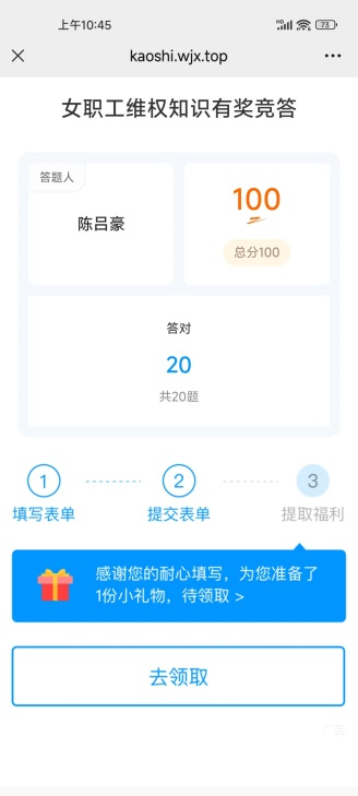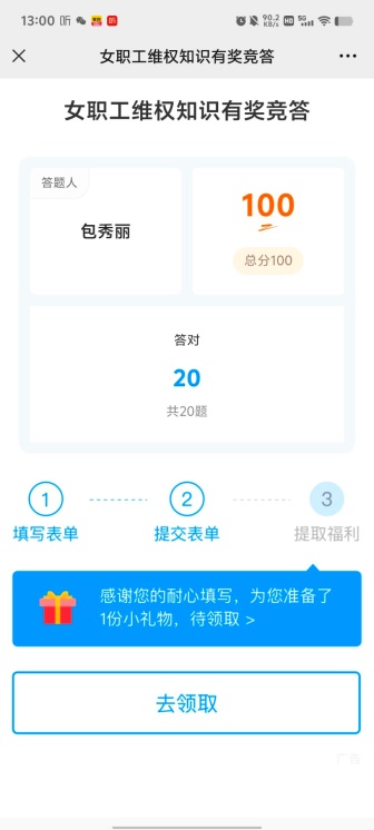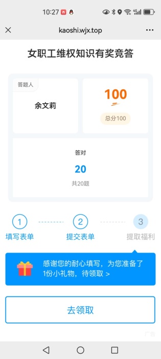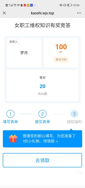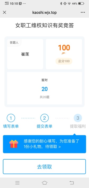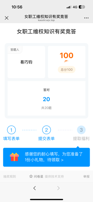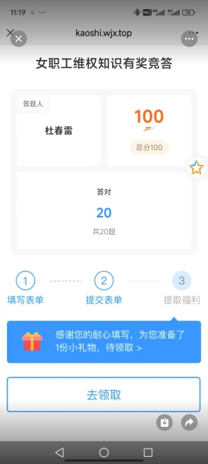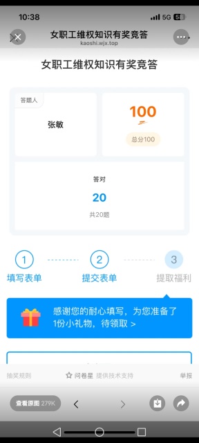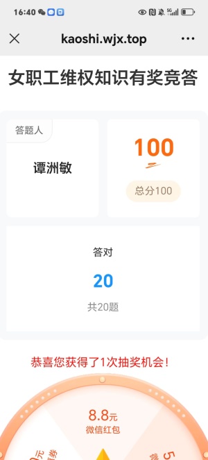 暗网禁区 开展三八节女职工维权知识竞答活动为倡导教职工学法、知法、用法,提高教职工自我保护意识,引导教职工依法维护权益。在2025年三八节来临之际,暗网禁区 工会开展了女职工维权知识竞答活动。 竞答时间为2025年3月12日-14日,持续两天。竞赛方式是老师们关注“暗网禁区 工会”微信公众号进行答题。竞赛内容为女职工维权相关知识。竞赛办法是每位女职工答题时,必须准确填写真实姓名、单位(全称)、手机号码。全部题目答完,点击提交结束答题。共20题,每题5分,总分100分。每位老师答题结束后将答题成绩截图发给余文莉。学院32 女职工积极参与答题活动,在规定时间内全部完成了答题,其中有24位老师取得了100分的成绩。 此次竞答活动得到了女职工们的热烈响应和积极参与。通过此次竞答活动,让老师们更进一步全面了解了女职工维权相关知识。今后学院将继续加强相关知识的宣传和学习,确保女职工的权益得到充分保障。 暗网禁区 分工会 2025年3月17日 撰稿:余文莉,初审:罗月,复审:肖恒,终审:谢正发