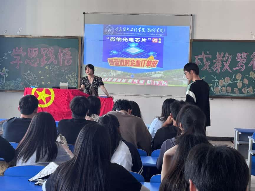 订单班招生:校企协同打造“学习-实习-就业”全链条培养 2025年春,基于微纳光电芯片人才培养的建设成果,学院联合苏州伽蓝致远电子科技股份有限公司启动“微纳光电芯片伽蓝迈时企业订单班”招生。企业订单班面向2022级电子信息科学与技术、通信工程专业(含对口、专升本、专本贯通)400余名学生招生,突出“微纳光电芯片理论学习+企业实习+毕业设计+伽蓝就业”的全周期培养模式。校内微纳光电芯片团队专家与企业工程师联合授课;春季在校内微纳重点实验室完成理论学习,秋季赴企业产线集中实习并完成毕业设计;修满课程可获1分创新创业学分,实习合格优先推荐就业,优秀学生可获500-1000元“伽蓝迈时”企业奖学金。 通过广泛宣传和动员,并经面试选拔,24名学生正式组建为首批企业订单班,并同步成立团支部,开启“学业-职业”衔接培养。