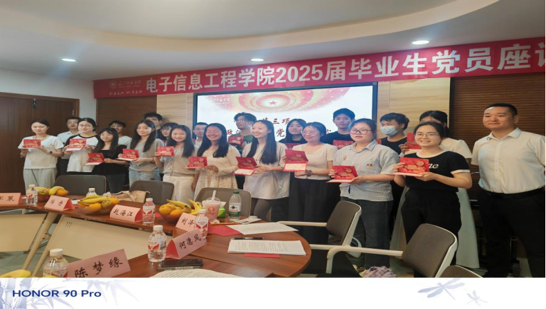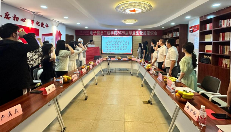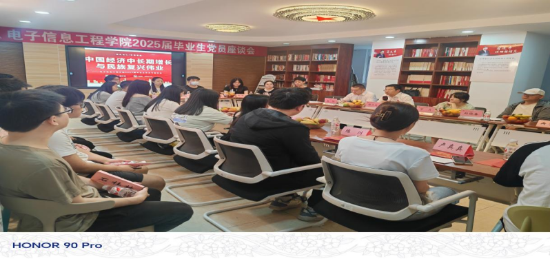 随后,党委书记谢正发以《中国经济中长期增长与民族复兴伟业》为题,为全体毕业生党员带来一堂深刻而振奋的专题党课。谢书记深入分析了我国经济发展态势,指出,在党的坚强领导下,中国经济长期向好的基本面没有改变。作为电子信息领域的青年党员,你们既是民族复兴的见证者,更应该是参与者和推动者。 座谈会上,罗月老师详细讲解了毕业生党员离校相关事宜。在师生交流环节,毕业生党员依次发言,深情回顾了在校期间的学习生活点滴,分享了在专业学习、实践锻炼、校园文化活动中的收获与成长,表达了对学院多年悉心培养的感恩之情。同时,同学们也对学院人才培养、教育教学、管理服务、基础设施改善等方面积极建言献策,表达了对母校未来发展的期待。