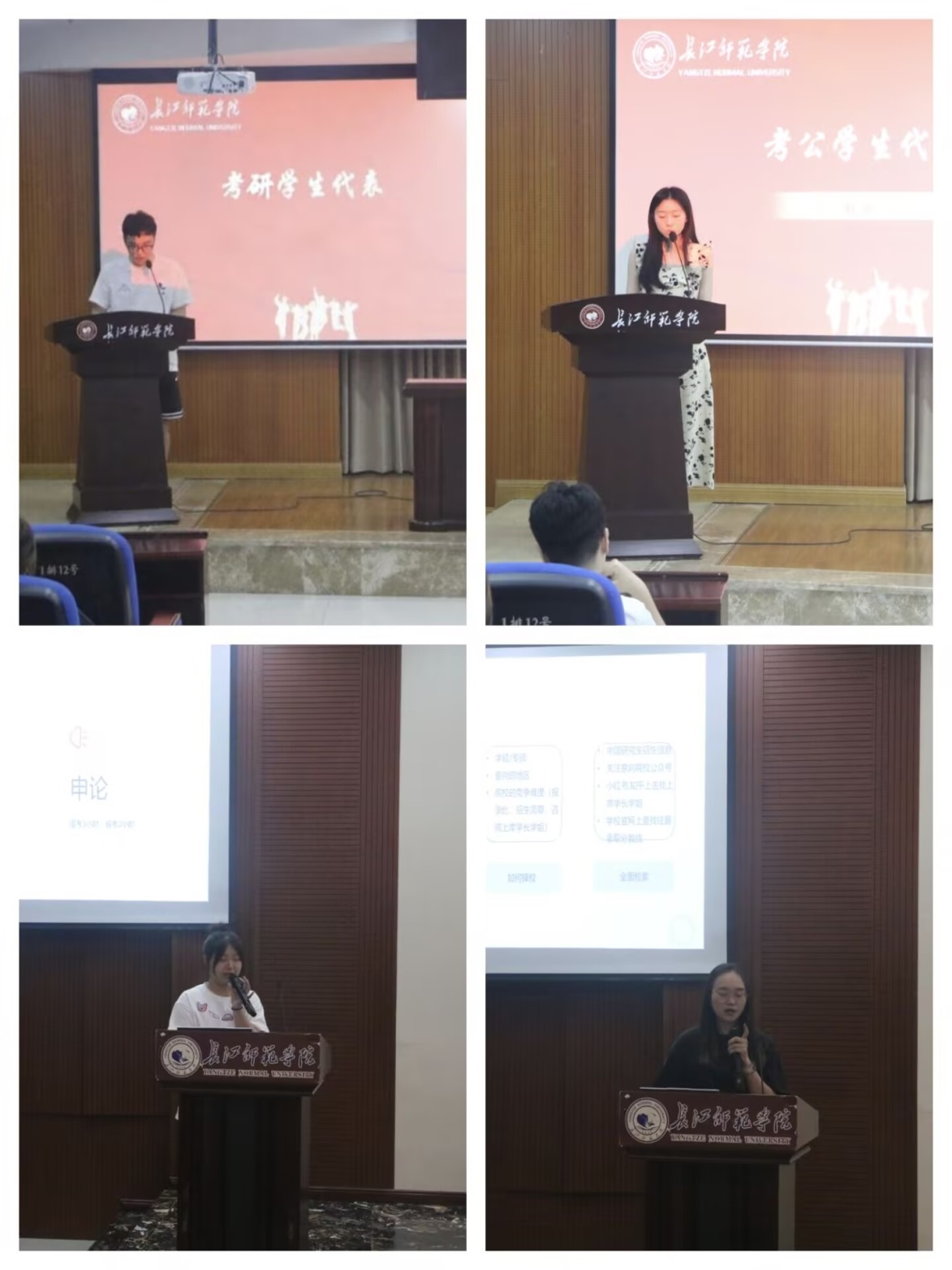 杜得荣主任要求同学们要重视实习过程、积累实践经验。夏锴主任提醒同学们严守实习纪律,主动沟通学习,确保实习成效。黄仕建主任强调毕业论文要体现专业知识运用与创新思考,鼓励同学们早规划、勤钻研,高质量完成论文。葛泽玲主任细致讲解了毕业实习要求,着重强调践行师德师风,将理论与实践深度融合。 25届优秀学子代表交流发言。田茜分享了自身考编复习中的时间管理、科目攻坚方法。王焘则从心态调整、信息收集等角度,讲述备考研究生的心路历程,为学弟学妹们提供实用经验,传递积极备考的信心与动力。彭雪从复习计划制定、学科重点突破到临考心态调适,毫无保留地分享实战经验。在教师招录、公务员考试中斩获佳绩的徐施微,结合自身备考经历,推荐了涵盖课程学习、题库训练等多领域的优质网站与教师资源,助力同学们精准备考,高效追梦。