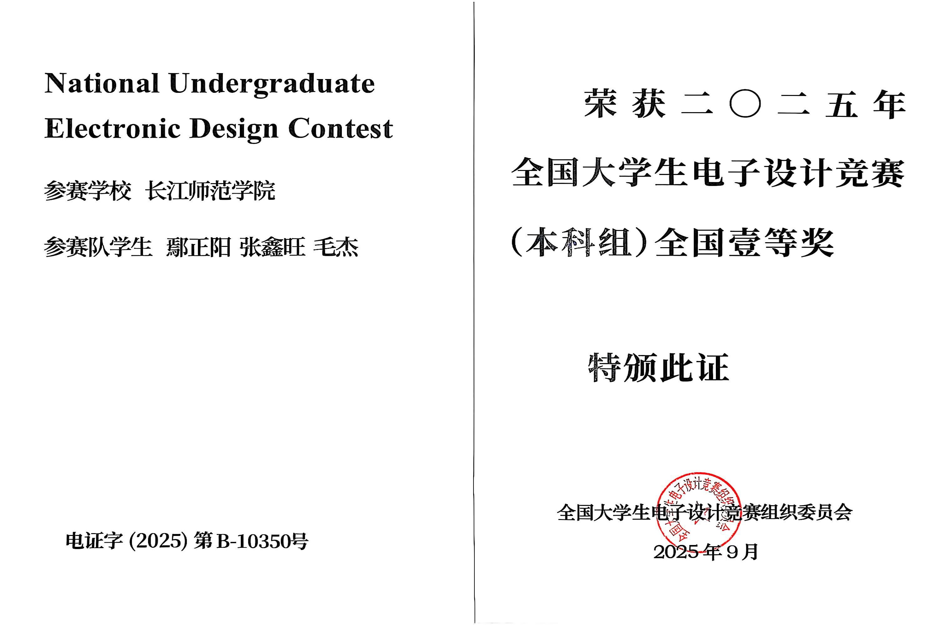 全国一等奖获奖率仅1.9%。全国竞赛组委会专家评价道,“长江师范学院这两支队伍的作品在效率指标、稳定性控制和创新设计三个维度均达到国内顶尖水平,尤其是自适应负载调节算法,展现出超越本科生平均水平的工程实践能力。”
