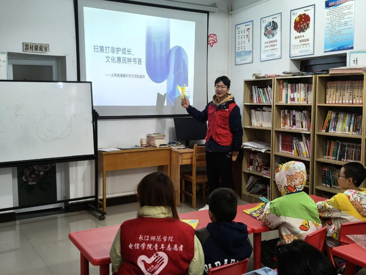 打黄扫非护成长、文化惠民种书香 ——“萤火虫之家”宏义社区支教活动通讯员:谭娜 以青春之力践行社会责任,用暖心陪伴守护童心成长。11月22日上午,“萤火虫之家”带领十名志愿者前往宏义市民学校开展以“打黄扫非护成长、文化惠民种书香”为主题的社区支教活动,参与此次支教活动的人员有“萤火虫之家”第一小组以及宏义市民学校的小朋友们。 活动前期,志愿者团队提前与宏义社区沟通,明确小朋友的数量与需求,针对性制定了“主题宣讲+趣味陪伴”的支教方案,同时,志愿者们精心准备宣讲资料、文具、手工材料等物资,为小朋友们带去丰富且有趣的体验。 当日8点40分,志愿者们准时集结于校东门,带着精心筹备的物资与满心热忱,统一前往宏义市民学校,为社区的孩子们送去知识、送去快乐,传递社会温暖力量。抵达社区后,志愿者们首先以主题宣讲拉开序幕——围绕“打黄扫非护成长、文化惠民种书香”,用生动案例科普辨别不良信息的技巧,引导孩子养成健康阅读习惯。