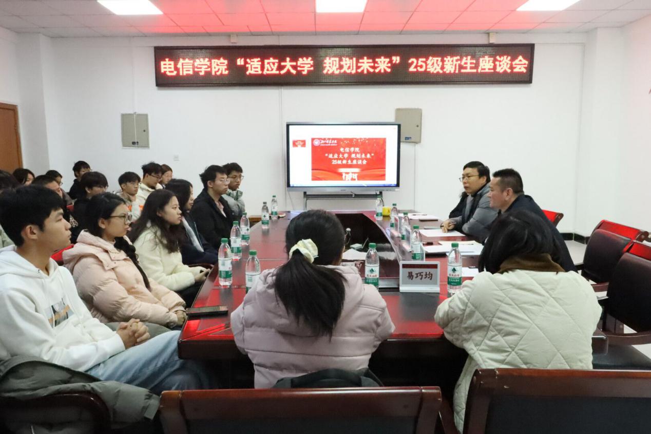 2025级新生座谈会在此顺利举行。党委副书记肖恒、通信工程系主任杜得荣、物理系主任葛泽玲、班导师代表易巧钧和孙德仙老师,以及各班班长、团支书、学习委员和团学主要干部齐聚一堂。25级辅导员谭洲敏主持会议。