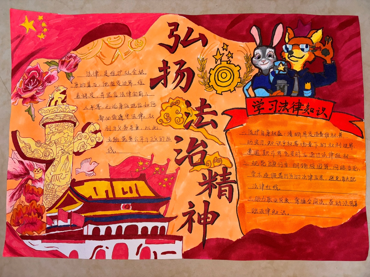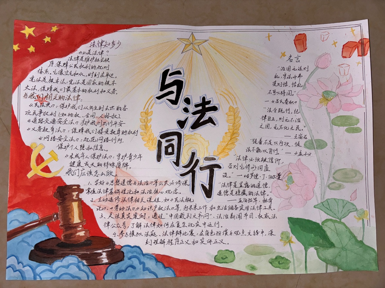 二等奖作品则分别以“与法同行”为主题,融入法槌、荷花等象征元素,或结合《疯狂动物城》卡通形象增添趣味性,亦有以国潮醒狮、12·4国家宪法日为设计亮点的作品,均展现出学生对法治知识的理解与创新表达能力。