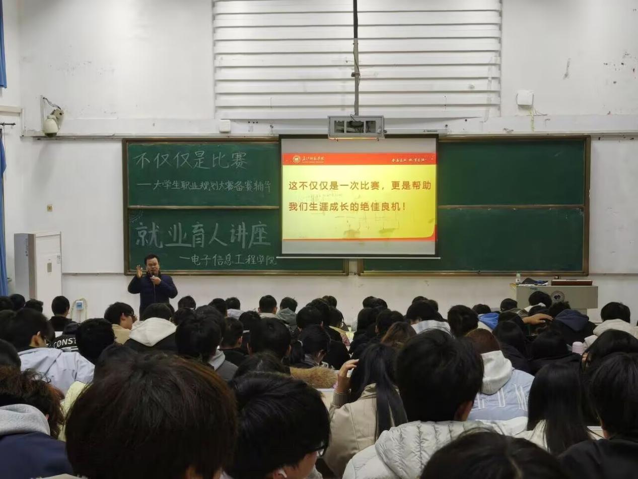 于诚意楼01阶梯教室举办了以“不仅仅是比赛—职业生涯规划大赛备赛指导”为主题的就业育人讲座。研究生导师文军教授主讲,25级电子信息类全体同学参加。