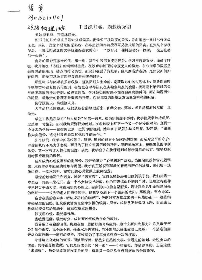 本次大赛面向学院全体学生,围绕 “我的大学成长答卷” 核心主题,鼓励学子立足真实经历,分享学习中的突破与困惑、校园生活的点滴温暖、对人生的深刻感悟及对未来的美好展望。活动期间,共征集到 19 篇优质作品,字里行间满含真情实感:有学子细数在实验室熬夜备战竞赛的坚持,有同学记录社团工作与志愿服务中的蜕变,也有青年畅谈对专业学习与人生规划的深度思考,每一篇征文都是一段鲜活的成长印记。