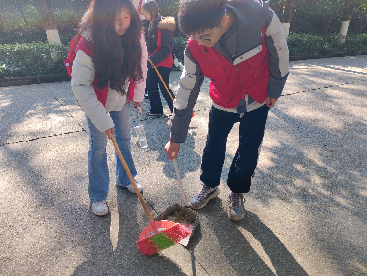 活动现场,志愿者们身着统一的志愿服,以饱满的热情投入清理工作。环湖步道组的志愿者沿着鉴湖的石板步道仔细巡查,对路面的纸屑、落叶、饮料瓶进行逐一捡拾;亲水平台组的同学则格外小心,俯身探向湖边石缝与护栏间隙,将隐藏其中的塑料包装袋、零食碎屑甚至钓鱼线等杂物清理出来;花坛绿植组的成员则手持小铲子,耐心铲除花坛里的口香糖污渍,并用扫帚清扫草丛中的枯枝败叶与烟蒂。经过一个半小时的努力,志愿者们共清理出各类垃圾十余袋,鉴湖周边的环湖步道、亲水平台、花坛绿植区焕然一新,原本散落的垃圾消失不见,湖水与岸边的绿植相映成趣,鉴湖的生态景观得到了明显改善。