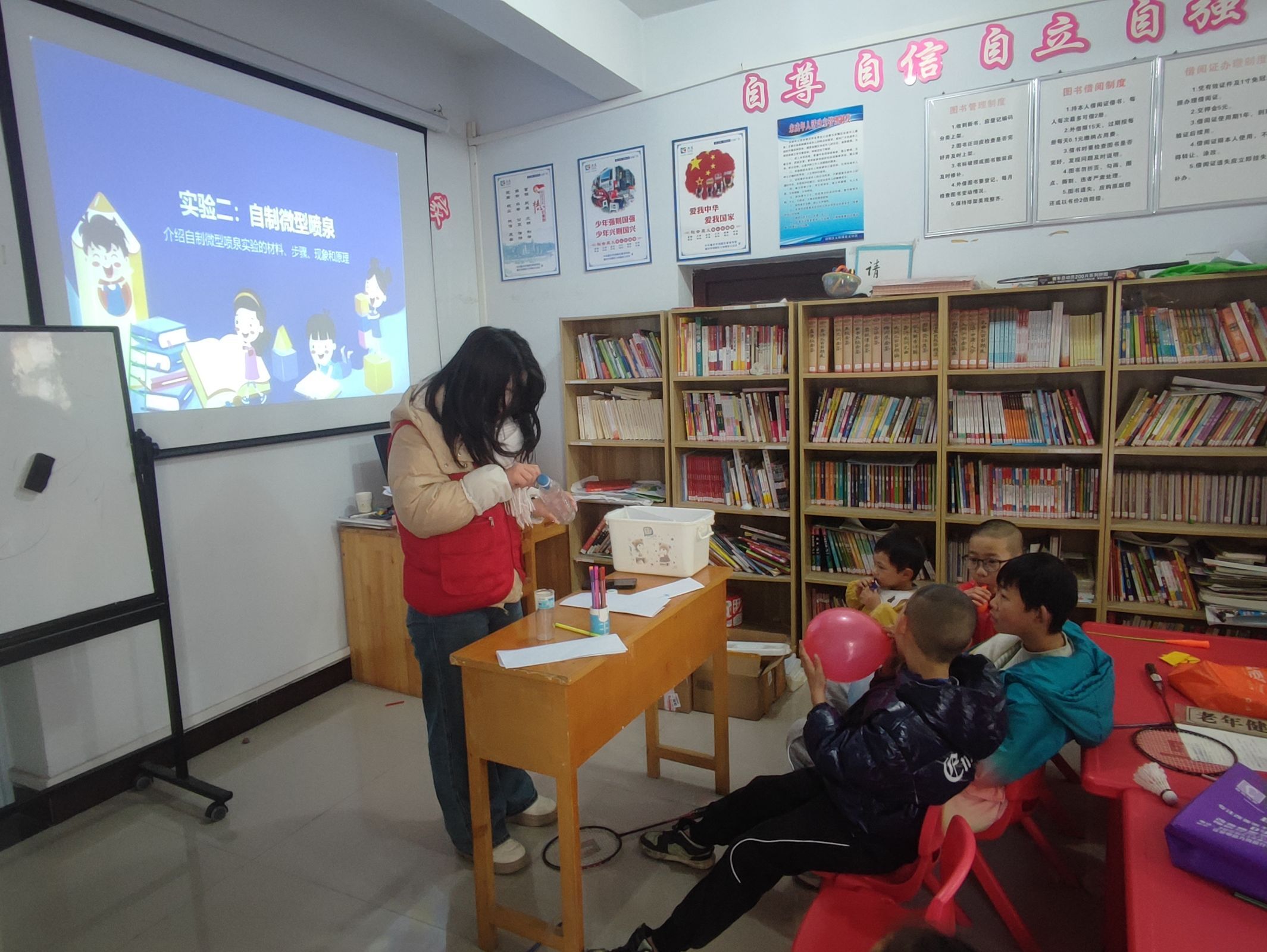 在“自制微型喷泉”实验中,志愿者指导小朋友分组操作,完成扎孔、固定气球、吹气注水等步骤。当松开瓶身小孔,清水从瓶盖小孔喷出形成喷泉,小朋友们通过调整按压力度观察喷泉高度变化。志愿者详细拆解原理,解释压力差是喷泉形成的关键,耐心解答小朋友的疑问。
